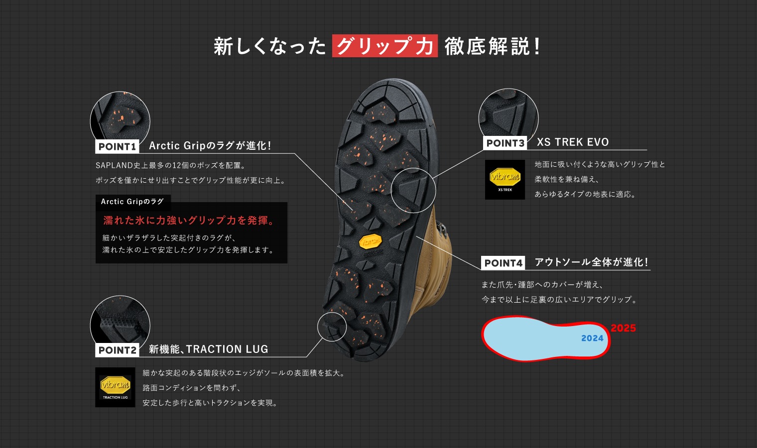 サップランドには、登山靴でも有名な ヴィブラム社製の「アークティック・グリップ A.T.」が採用されています。