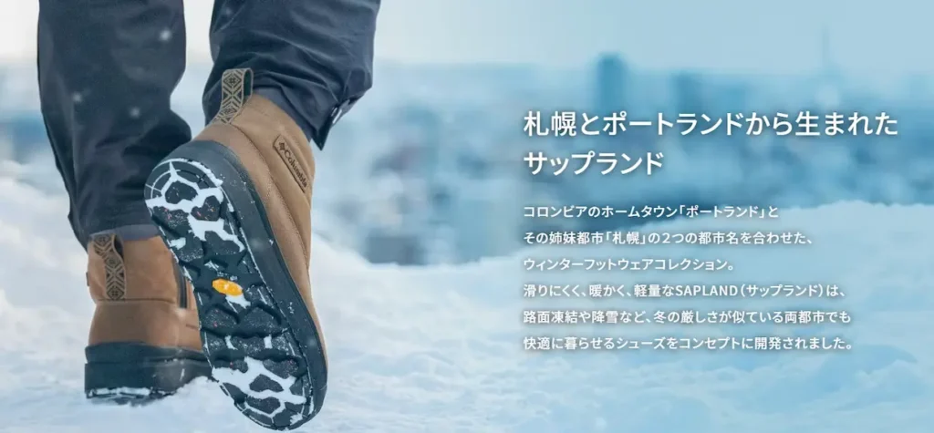 コロンビアのサップランドは、ヴィブラム製アウトソールによる濡れた氷上での高い防滑性能や、0.5cm刻みのサイズ展開、耐久性の高さなど、全体的に“しっかり冬に備えた靴を選びたい人にぴったりな一足です!