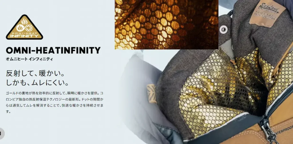 「オムニヒートインフィニティ」は、内側に見える金色のドット柄の生地のことで、自分の体温を反射する技術となっています。